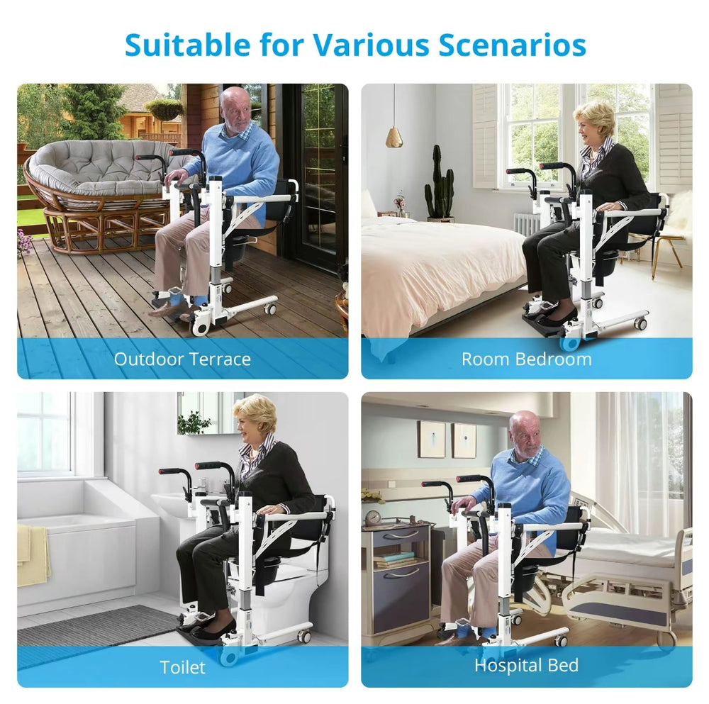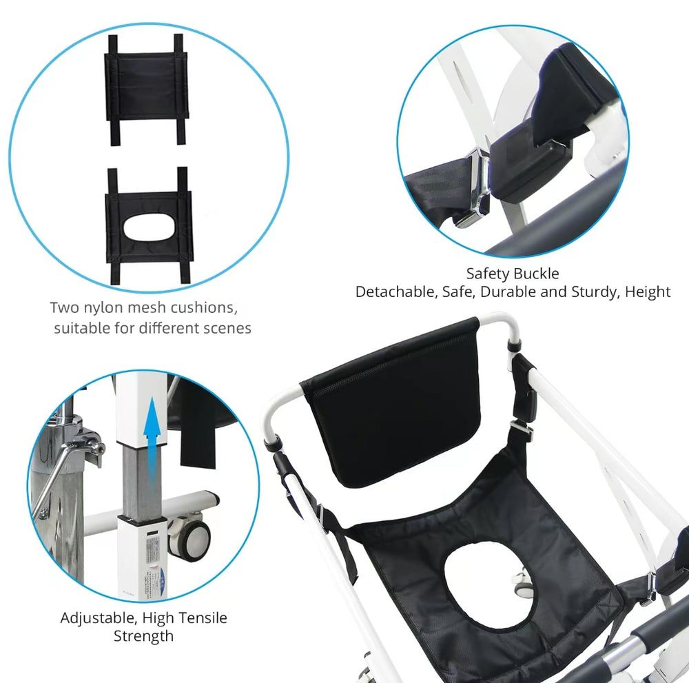 Experience unparalleled versatility and comfort with our 4-in-1 multifunctional wheelchair. Designed to meet various care needs, this innovative chair combines a shower chair, commode, patient lift, and transfer wheelchair in one comprehensive solution.
